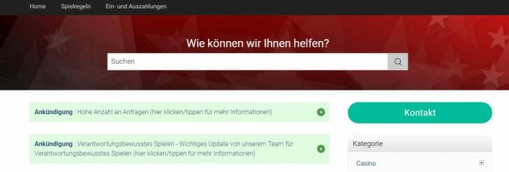At the top of the website you will find the help button. Once clicked, players are first the most important FAQs and most read articles on known topics are displayed. If the answer cannot be found here, then the support can be contacted at any time. To do so, simply click on "Contact".